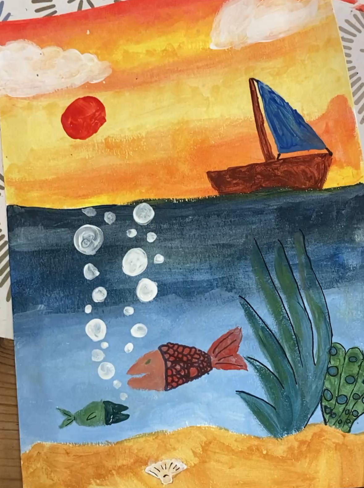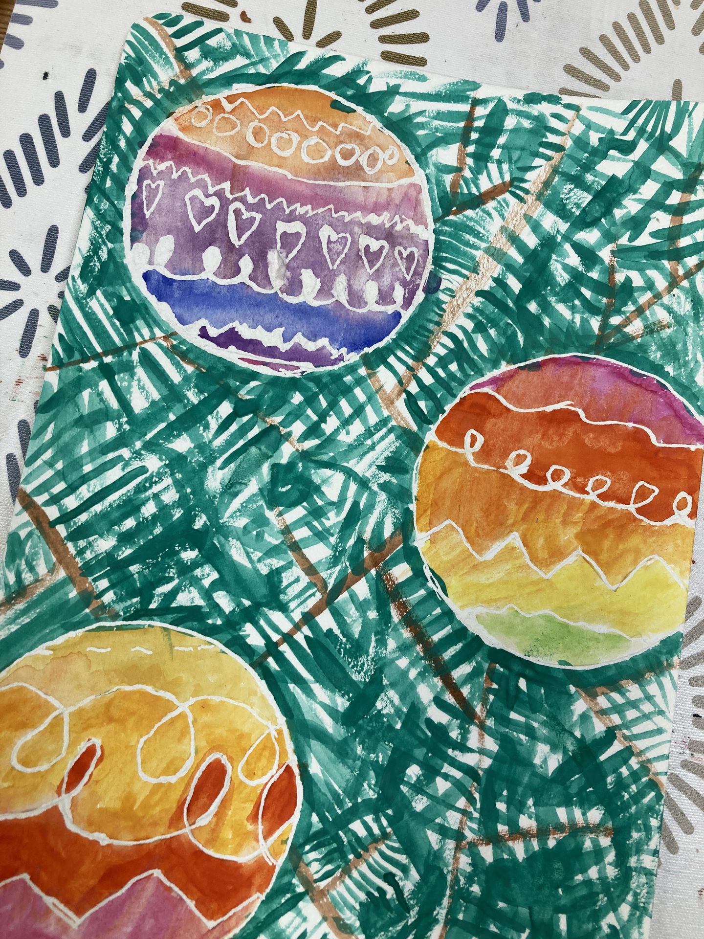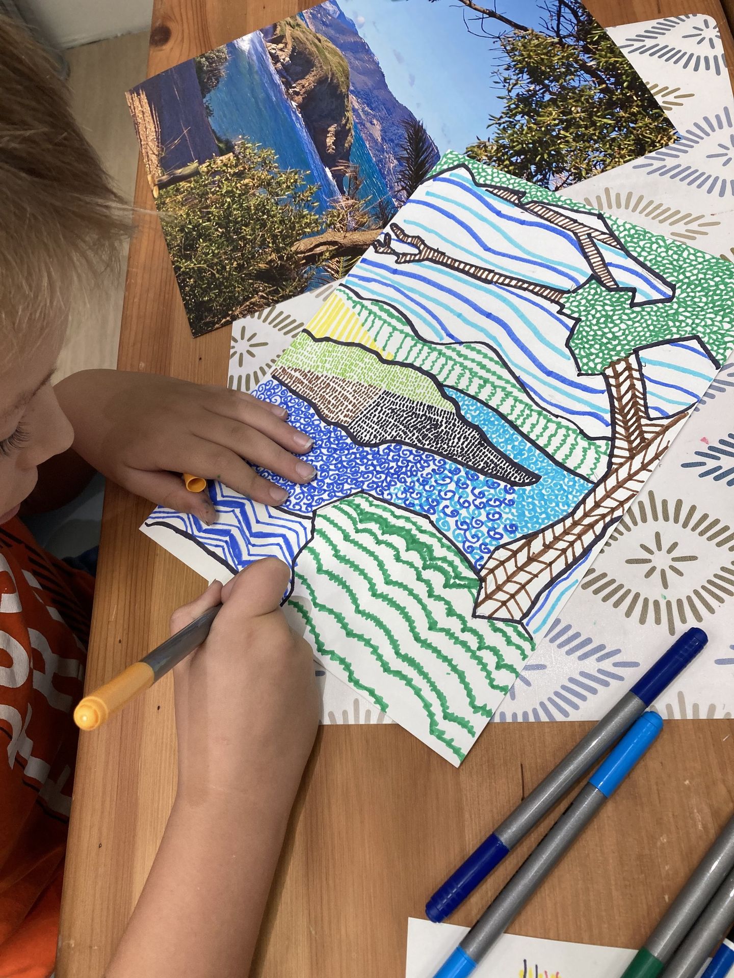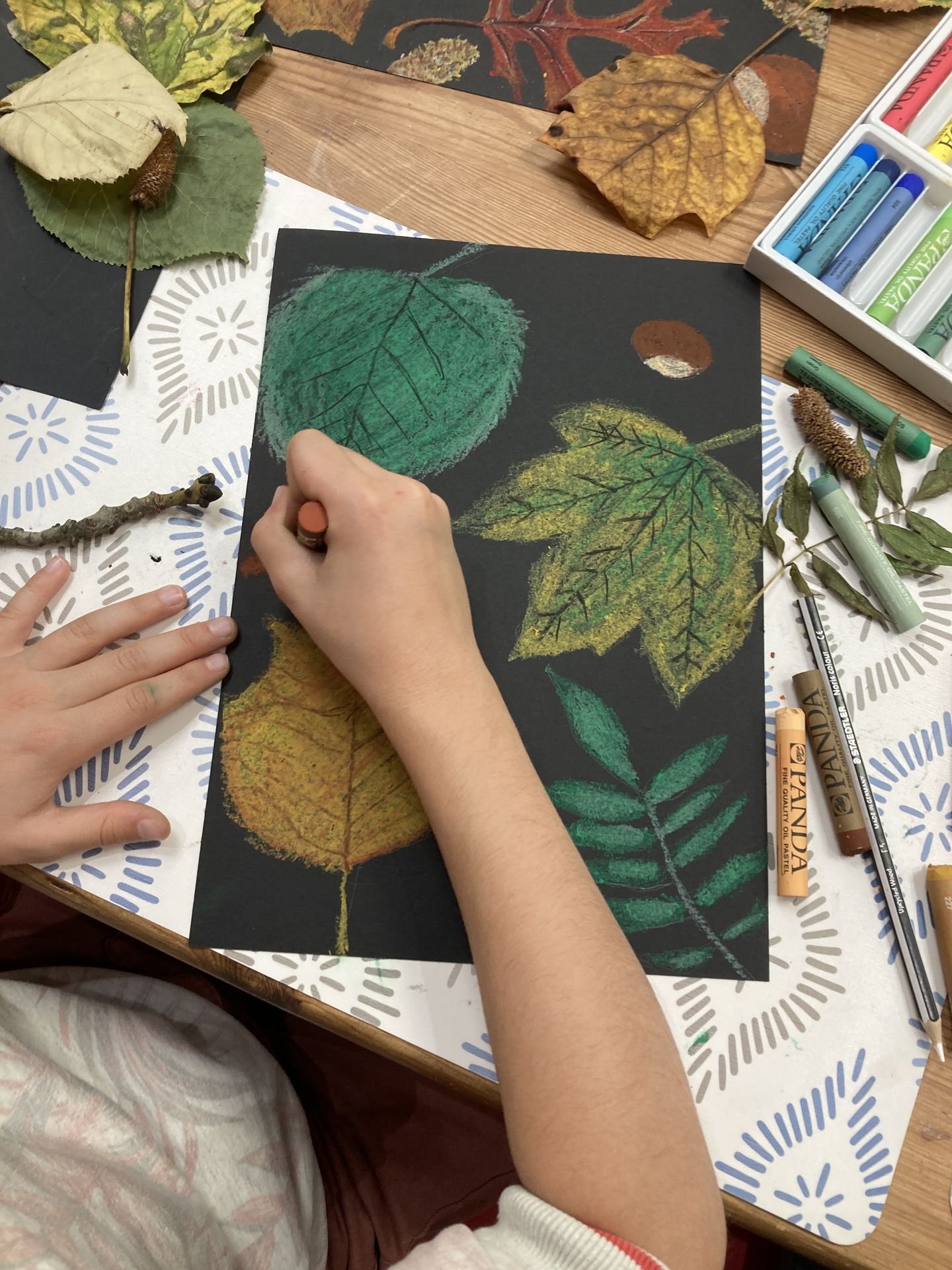 • Apprentissage de diverses techniques picturales et leurs dérivés : crayon, feutre, pastel, craie, peinture, pochoir, tamponnage, grattage, découpage, dégradé, camaïeu, etc.